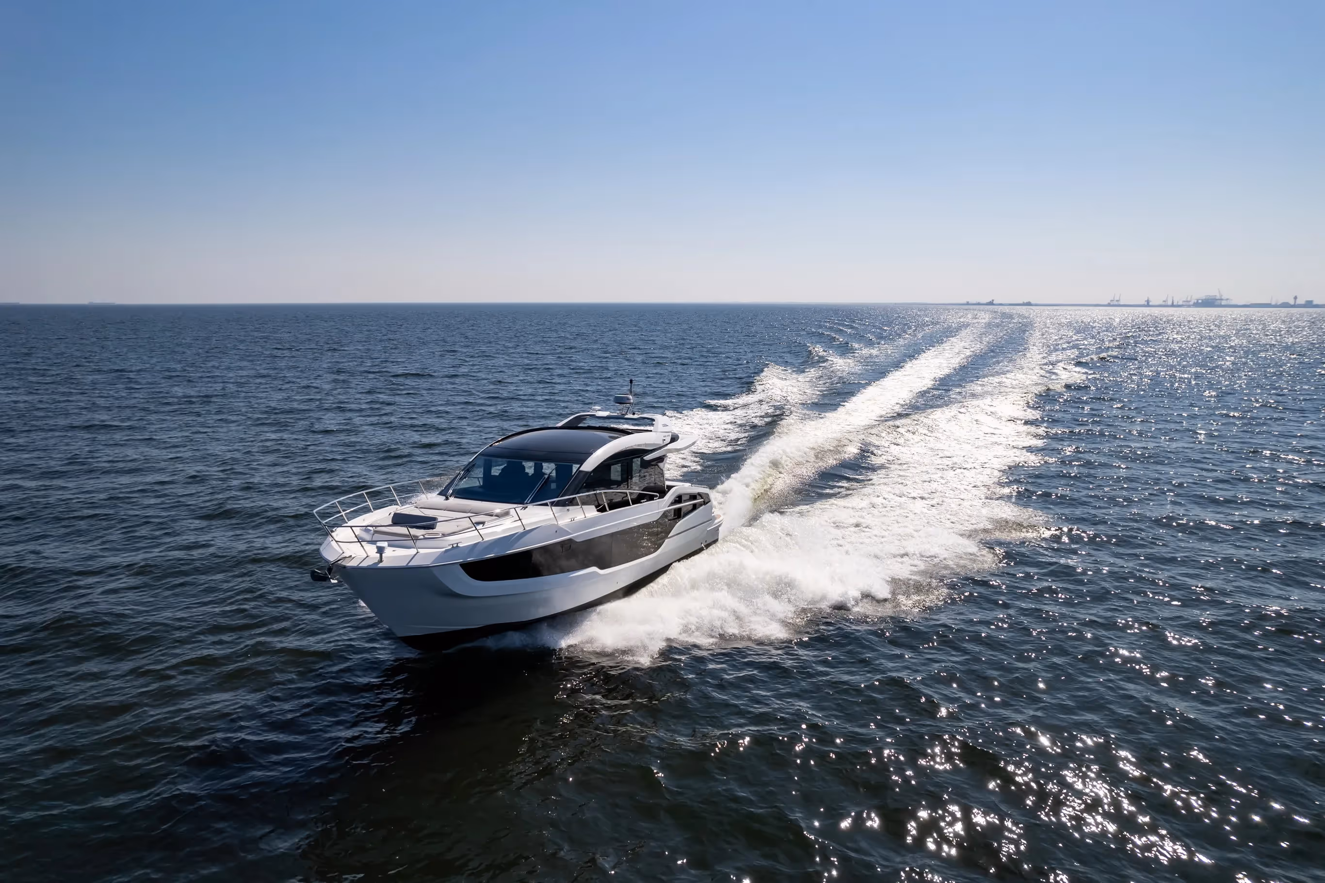 A highlight of the exterior is the large electric sunroof, which brings the open-air feeling of a flybridge into the sleek form of a coupe, offering sunlight and fresh breeze at the touch of a button.