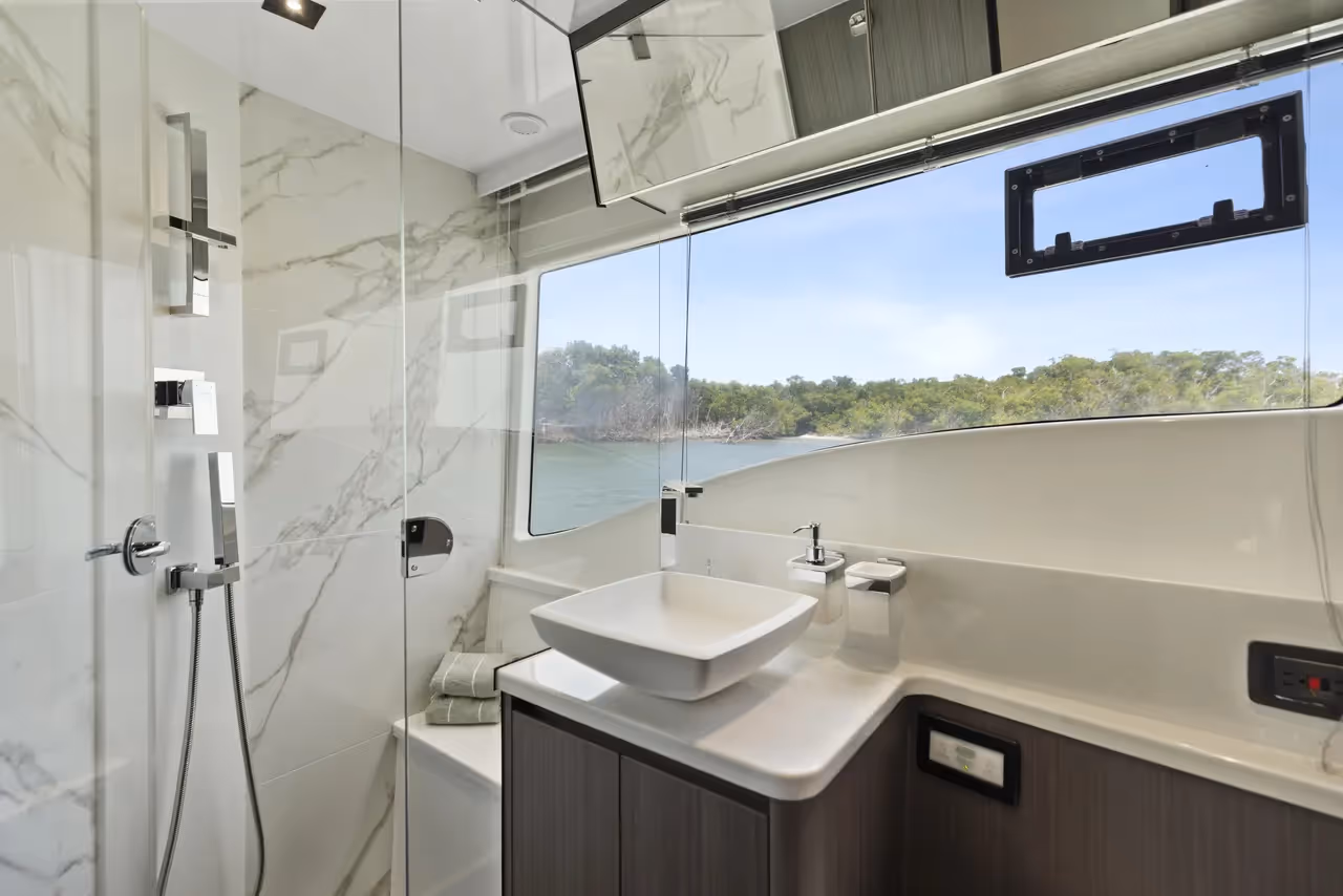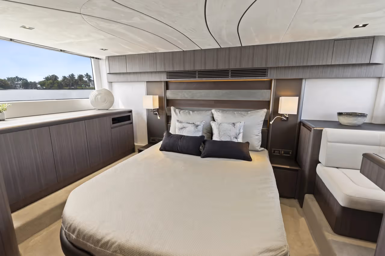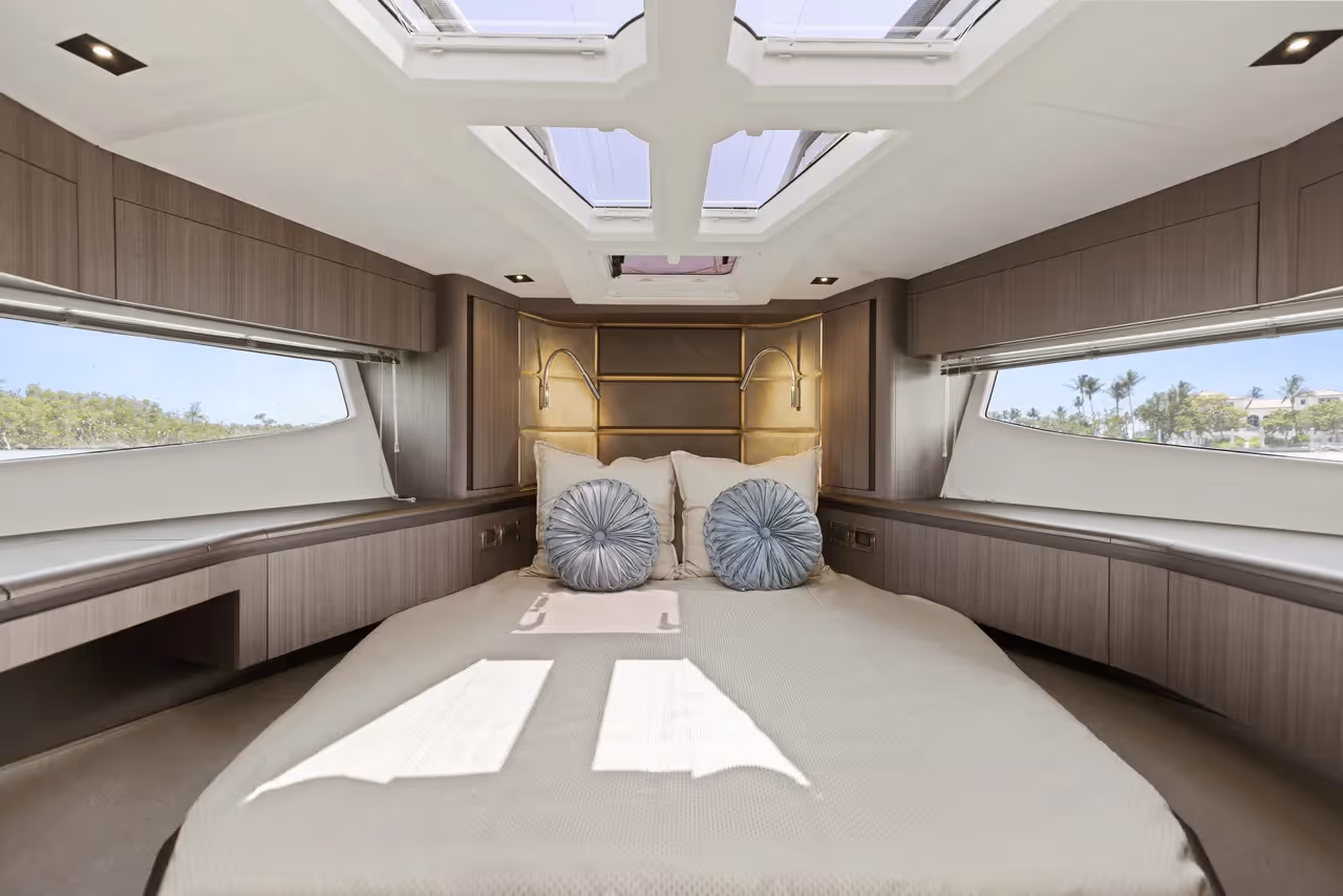 Luxurious owner’s stateroom with private bathroom, large hull windows, and refined finishes for maximum comfort and privacy.