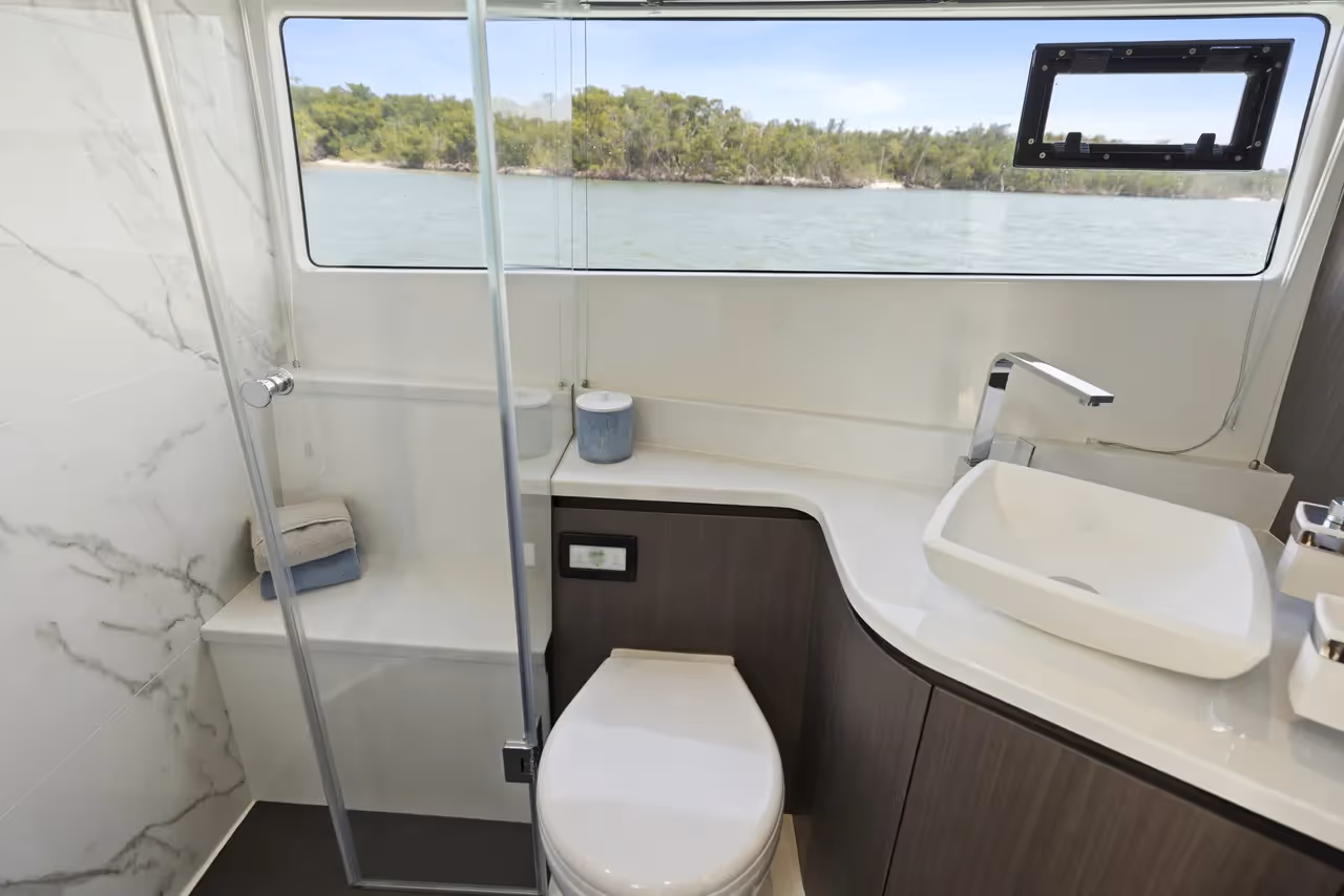 Below deck, the yacht offers a three-cabin layout that comfortably accommodates up to six guests. The full-beam master suite amidships features generous storage, a private en-suite bathroom, and large hull windows for stunning sea views. Forward, the VIP cabin and guest cabin provide stylish, well-appointed spaces for family or friends.