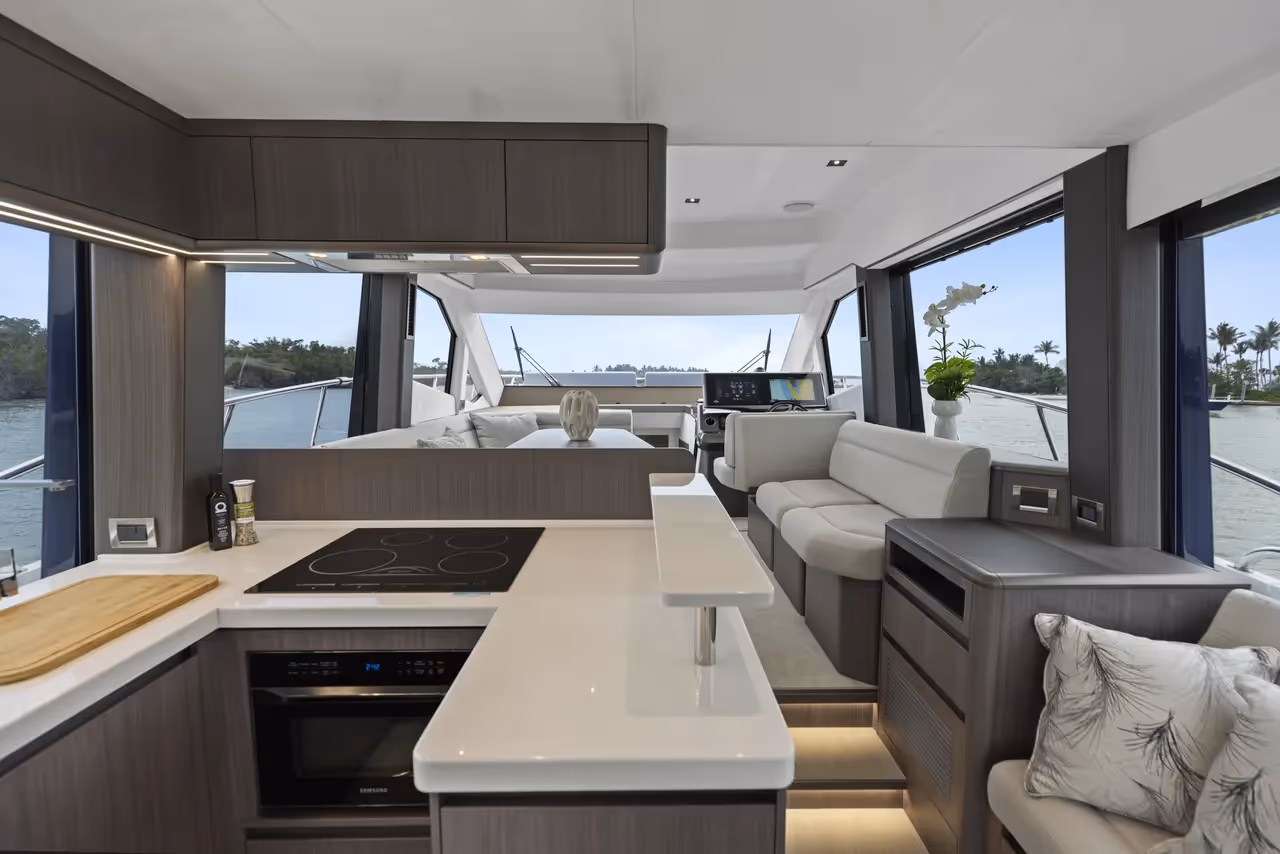 Spacious salon with panoramic windows, direct cockpit access, and a seamless connection between the galley, dining, and lounging areas.
